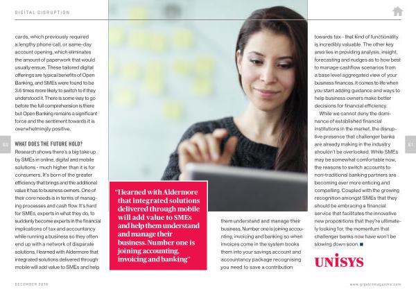 Research shows there ’ s a big take up by SMEs in online , digital and mobile solutions - much higher than it is for consumers . It ’ s born of the greater efficiency that brings and the additional value it has to business owners . One of their core needs is in terms of managing processes and cash flow . It ’ s hard for SMEs , experts in what they do , to suddenly become experts in the financial implications of tax and accountancy while running a business so they often end up with a network of disparate solutions . I learned with Aldermore that integrated solutions delivered through mobile will add value to SMEs and help
