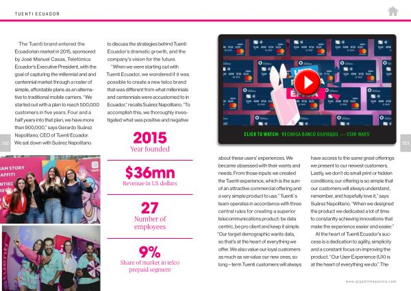 CLICK TO WATCH : ‘ RECARGA BANCO GUAYAQUIL — STAR WARS ’ 103 about these users ’ experiences . We became obsessed with their wants and needs . From those inputs we created the Tuenti experience , which is the sum of an attractive commercial offering and a very simple product to use .” Tuenti ´ s team operates in accordance with three central rules for creating a superior telecommunications product : be data centric , be pro client and keep it simple . “ Our target demographic wants data , so that ’ s at the heart of everything we offer . We also value our loyal customers as much as we value our new ones , so long — term Tuenti customers will always