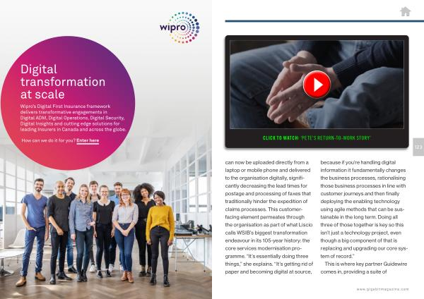 CLICK TO WATCH : ‘ PETE ’ S RETURN-TO-WORK STORY ’ 123 can now be uploaded directly from a laptop or mobile phone and delivered to the organisation digitally , significantly decreasing the lead times for postage and processing of faxes that traditionally hinder the expedition of claims processes . This customerfacing element permeates through the organisation as part of what Liscio calls WSIB ’ s biggest transformation endeavour in its 105-year history : the core services modernisation programme . “ It ’ s essentially doing three things ,” she explains . “ It ’ s getting rid of paper and becoming digital at source ,