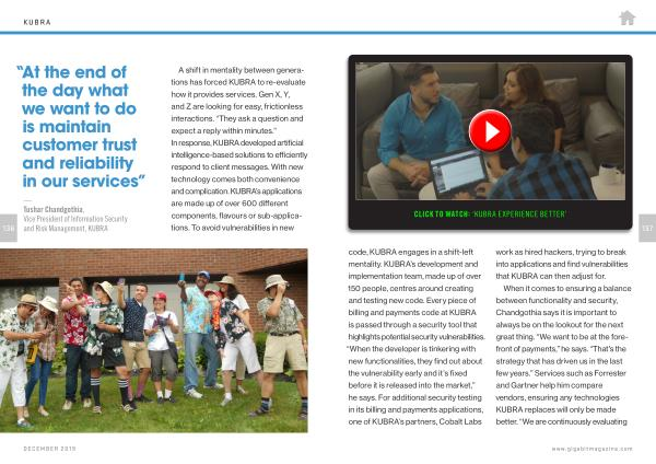 CLICK TO WATCH : ‘ KUBRA EXPERIENCE BETTER ’ 137 code , KUBRA engages in a shift-left mentality . KUBRA ’ s development and implementation team , made up of over 150 people , centres around creating and testing new code . Every piece of billing and payments code at KUBRA is passed through a security tool that highlights potential security vulnerabilities . “ When the developer is tinkering with new functionalities , they find out about the vulnerability early and it ’ s fixed before it is released into the market ,” he says . For additional security testing in its billing and payments applications , one of KUBRA ’ s partners , Cobalt Labs