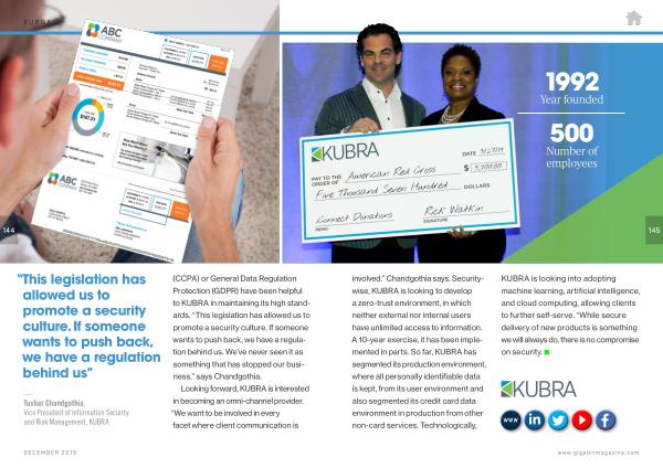 ( CCPA ) or General Data Regulation Protection ( GDPR ) have been helpful to KUBRA in maintaining its high standards . “ This legislation has allowed us to promote a security culture . If someone wants to push back , we have a regulation behind us . We ’ ve never seen it as something that has stopped our business ,” says Chandgothia .