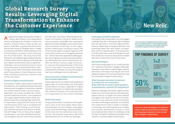 As digital technologies dramatically reshape in industry after industry , most organizations are pursuing large-scale changes to capture the benefits of these trends or keep up with competitors . New Relic , in partnership with Vanson Bourne , led a survey of 750 global senior IT leaders at enterprises with 500 to 5,000 employees in the United Kingdom , Australia , France , Germany , and the United States . The study found that enterprises are making progress despite obstacles . IT leaders within these companies are finding that their digital transformations lead to significant challenges , such as increased pressure to prove the business value of said transformations . Interestingly , almost 50 % of the global respondents admit that problems in their software are more likely to be discovered by their customers than by their own teams .