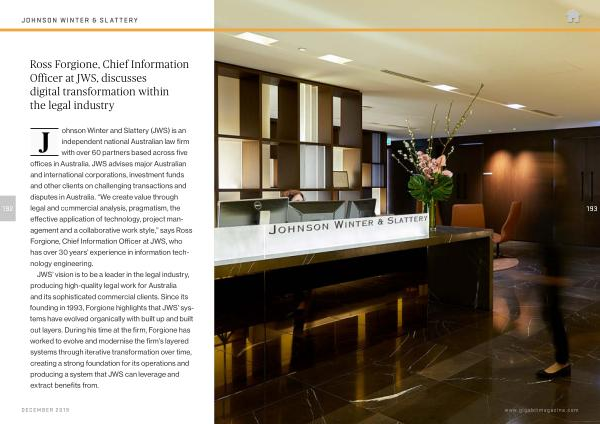 J ohnson Winter and Slattery ( JWS ) is an independent national Australian law firm with over 60 partners based across five offices in Australia . JWS advises major Australian and international corporations , investment funds and other clients on challenging transactions and disputes in Australia . “ We create value through legal and commercial analysis , pragmatism , the effective application of technology , project management and a collaborative work style ,” says Ross Forgione , Chief Information Officer at JWS , who has over 30 years ’ experience in information technology engineering .