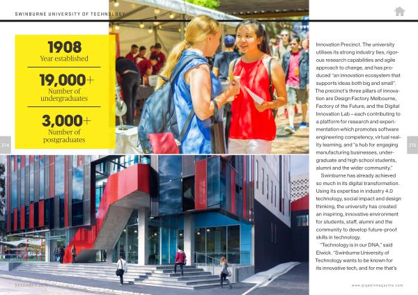 Innovation Precinct . The university utilises its strong industry ties , rigorous research capabilities and agile approach to change , and has produced “ an innovation ecosystem that supports ideas both big and small ”. The precinct ’ s three pillars of innovation are Design Factory Melbourne , Factory of the Future , and the Digital Innovation Lab – each contributing to a platform for research and experimentation which promotes software engineering competency , virtual reality learning , and “ a hub for engaging manufacturing businesses , undergraduate and high school students , alumni and the wider community .”