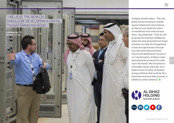 of digital transformation . “ The next phase will be focusing on stabilising and utilising the new solutions , so that we can realise the return on investment from what we have done ,” says Mughrabi . “ Then we will be going into business intelligence , where the data generated from those solutions can help the management to take the right decision through accurate and timely presented reports and dashboards . As part of our transformation , Al Gihaz is also diversifying the products it is offering to the market . We ’ ve started on renewable energy with solar , and I believe there are other renewable energy initiatives that could be introduced like wind and other sources , in addition to smart solutions .”