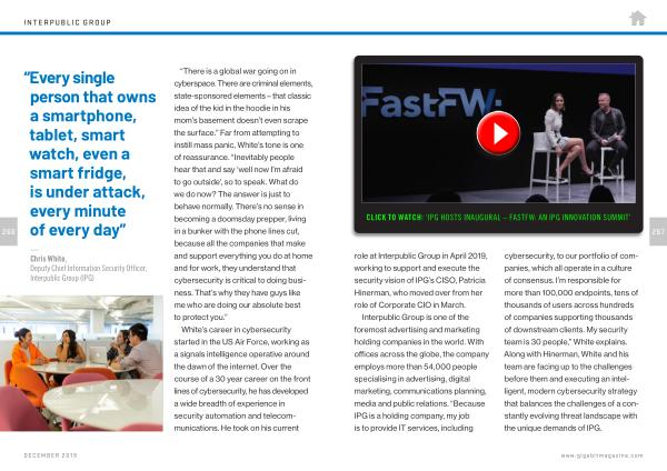 cybersecurity , to our portfolio of companies , which all operate in a culture of consensus . I ’ m responsible for more than 100,000 endpoints , tens of thousands of users across hundreds of companies supporting thousands of downstream clients . My security team is 30 people ,” White explains . Along with Hinerman , White and his team are facing up to the challenges before them and executing an intelligent , modern cybersecurity strategy that balances the challenges of a constantly evolving threat landscape with the unique demands of IPG .