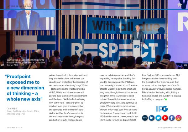 275 upon good data analysis , and that ’ s impactful ,” he explains . Looking forward to the new year , the IPG team has internally branded 2020 The Year of Data Quality . In both the short and long term , though , the most important thing that White is working to build is trust . “ I need to increase services efficiently , build trust , and continue to make IPG ’ s operations more secure without incurring a cost to its ability to do business . I ’ m really very grateful to IPG for this chance . I never , ever , in my life thought I would be deputy CISO for a Fortune 300 company . Never . Not five years earlier I was working with the Department of Defense , and then 15 years before that I got out of the Air Force as a lower-level enlisted member . This is kind of like being a kid , hitting a home run and all of a sudden I ’ m playing in the Major Leagues .”