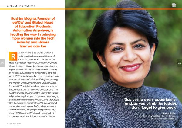 R ashim Mogha is clearly the woman to watch . eWOW ( empowered Women of the World ) founder and the The Global Head of Education Products , Automation Anywhere University , best-selling author , keynote speaker and equality influencer has just been awarded Woman of the Year 2019 . This is the third award Mogha has won in 2019 alone , having also been recognised as a Woman of Influence for Silicon Valley , and winning the Women Empowerment : Game Changer Award for her eWOW initiative , which empowers women to be successful , and for her career achievements . “ I ’ ve had the privilege of working at the forefront of cuttingedge technology throughout my career ,” says Mogha , a veteran of companies like VMware , AWS and Oracle . “ I led the education program for AWS , including bootcamps at re : Invent , annual AWS conference where we trained over 8,000 people during a three-day event .” AWS provided Mogha with an opportunity to create education solutions that can function in