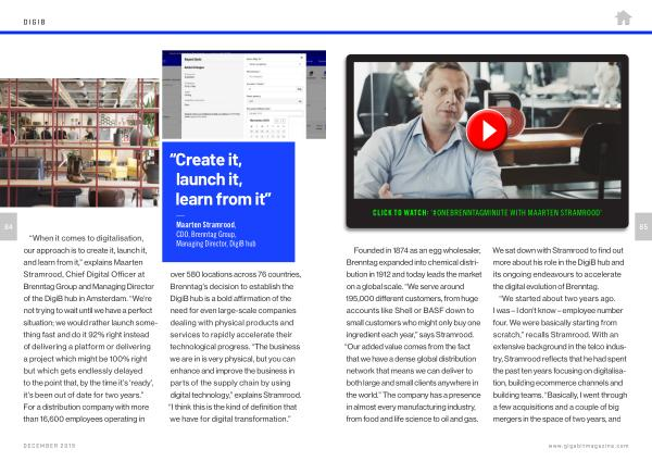 “ When it comes to digitalisation , our approach is to create it , launch it , and learn from it ,” explains Maarten Stramrood , Chief Digital Officer at Brenntag Group and Managing Director of the DigiB hub in Amsterdam . “ We ’ re not trying to wait until we have a perfect situation ; we would rather launch something fast and do it 92 % right instead of delivering a platform or delivering a project which might be 100 % right but which gets endlessly delayed to the point that , by the time it ’ s ‘ ready ’, it ’ s been out of date for two years .” For a distribution company with more than 16,600 employees operating in