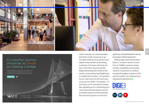 wider business , but acknowledges that there is still a long way to go . “ It ’ s quite thrilling , this evolution and digital enhancement of Brenntag .” Looking to the future , the three pillars of Connect , Source and the Digital Marketing will remain at the centre of everything that DigiB does to realise this evolution . “ It ’ s going to be our main focus for the next year , as we go into 2020 ,” he explains . “ In the future , we ’ re looking into things like speeding up our onboarding process and exploring ways to use IoT to simplify aspects of the business . The long-term goal is to move into digitising and optimising the internal processes of Brenntag itself .”