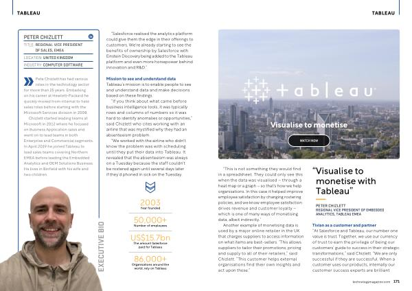 Chizlett started leading teams at Microsoft in 2012 where he focused on Business Application sales and went on to lead teams in both Enterprise and Commercial segments . In April 2019 he joined Tableau to lead sales teams covering Northern EMEA before leading the Embedded Analytics and OEM Solutions Business . He lives in Binfield with his wife and two children .