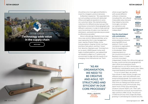 FRANS J . BEERKENS , DIRECTOR , FETIM GROUP where we got together with several different software companies ; including Infor , who offered measurable value , because they helped us become more agile , centralise our operations and become geographically independent .”