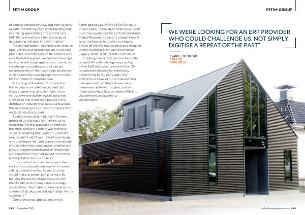 Fetim added was INFOR-CPQ ( Configure , Price , Quote ). “ Allowing to make quick ( B2B ) customer quotations for both standard and Made2Measure products is of great benefit to us . It allows us to quote on complex orders efficiently , reduce costs and mistakes ” Beerkens added . Next-up is Infor Nexus ( Supply-chain , Birst ( BI ) and Coleman-AI .