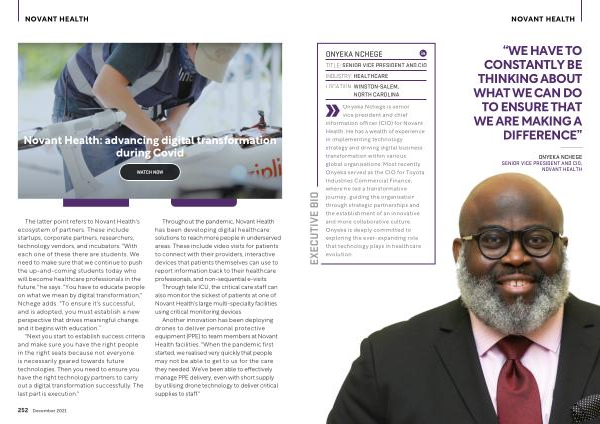 Onyeka Nchege is senior vice president and chief information officer ( CIO ) for Novant Health . He has a wealth of experience in implementing technology strategy and driving digital business transformation within various global organisations . Most recently , Onyeka served as the CIO for Toyota Industries Commercial Finance , where he led a transformative journey , guiding the organisation through strategic partnerships and the establishment of an innovative and more collaborative culture . Onyeka is deeply committed to exploring the ever-expanding role that technology plays in healthcare evolution .