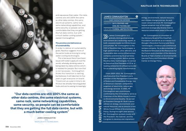 James Connaughton is a globally distinguished energy , environment and , technology expert , as both corporate leader and White House policymaker . Mr . Connaughton is the CEO of Nautilus Data Technologies , a high-performance , ultra-efficient , and sustainable data centre infrastructure company powered by its proprietary water-cooling system . Before joining Nautilus Data Technologies , he served as Executive Vice President of C3 . ai , a leading enterprise AI software provider for accelerating digital transformation .