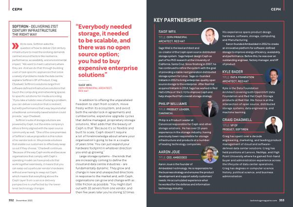 SoftIron ’ s suite of storage solutions are powered by Ceph , but the entire company ’ s ethos is firmly aligned with the open source community as well . “ One of the core premises of SoftIron ’ s value proposition is this notion of no vendor lock-in . We provide solutions that enable our customers to effectively swap us out if they choose ,” Chadwell continues . “ Because of the way Ceph works and because organisations that comply with Ceph ’ s operating model can have products that work together seamlessly , it means that you can swap out a particular vendor ' s hardware without ever having to swap out Ceph , which means that everything above the Ceph layer from a service delivery perspective is unaffected by the lower level technology changes .