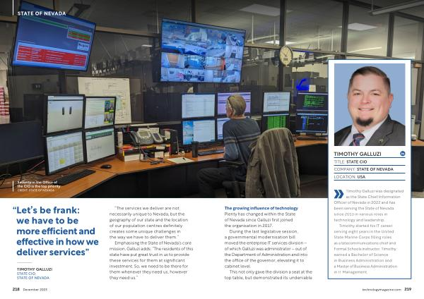 Timothy Galluzi was designated as the State Chief Information Officer of Nevada in 2022 and has been serving the State of Nevada since 2013 in various roles in technology and leadership .