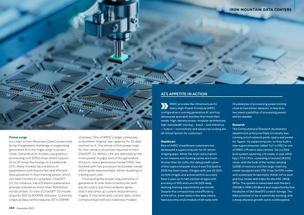 Power surge It is clear to Iron Mountain Data Centers that by far the greatest challenge in supporting generative AI is the huge surge in power loads . Generative AI models use graphics processing unit ( GPU ) chips which require 10 to 15 times the energy of a traditional CPU . Many models have billions of parameters and require fast and efficient data pipelines in their training phase , which can take months to complete . ChatGPT 3.5 , for instance , has 175 billion parameters and was trained on more than 500 billion words of text . To train a ChatGPT 3.5 model requires 300 to 500MW of power . Currently , a typical data centre requires 30 to 50MW of power . One of IMDC ’ s larger campuses , in Northern Virginia , has capacity for 10 data centres on it . The whole of the power load for this campus would be required to train ChatGPT 3.5 . While LLMs are definitely at the most power-hungry end of the generative AI boom , every generative model IMDC has worked with has processor and power needs which grow exponentially , either doubling or tripling each year .