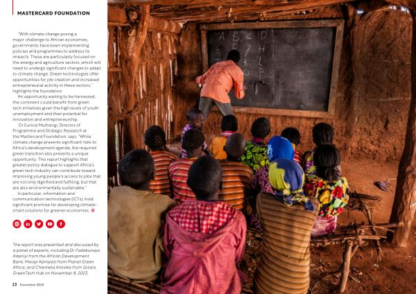 Dr Eunice Muthengi , Director of Programme and Strategic Research at the Mastercard Foundation , says : “ While climate change presents significant risks to Africa ’ s development agenda , the required green transition also presents a unique opportunity . This report highlights that greater policy dialogue to support Africa ’ s green tech industry can contribute toward improving young people ’ s access to jobs that are not only dignified and fulfilling , but that are also environmentally sustainable .”
