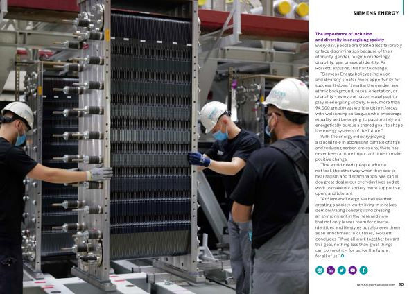 “ At Siemens Energy , we believe that creating a society worth living in involves demonstrating solidarity and creating an environment in the here and now that not only leaves room for diverse identities and lifestyles but also sees them as an enrichment to our lives ,” Rossetti concludes . “ If we all work together toward this goal , nothing less than great things can come of it – for us , for the future , for all of us .” technologymagazine . com 30