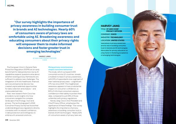 Harvey Jang , Cisco ’ s Vice President and Chief Privacy Officer , emphasises the significance of these findings : “ Our survey highlights the importance of privacy awareness in building consumer trust in brands and AI technologies .” Nearly 60 % of consumers aware of privacy laws are