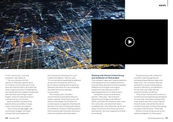 Working with Mission Critical Group and Jenbacher on Utah project The company’ s approach requires partners with expertise across multiple technical verticals. Rhea describes how E3 evaluated different technologies and original equipment manufacturers before selecting partners for its Utah project.