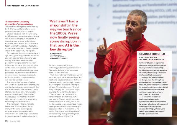 The pandemic accelerated this transformation dramatically. In his own words, Charley went from being a radical outsider to being one of the most popular people on campus.“ I was helping them change how they taught because we had to move online,” he recalls. Since then, use of Lynchburg’ s online learning management system has jumped from 12 % to 99 %.