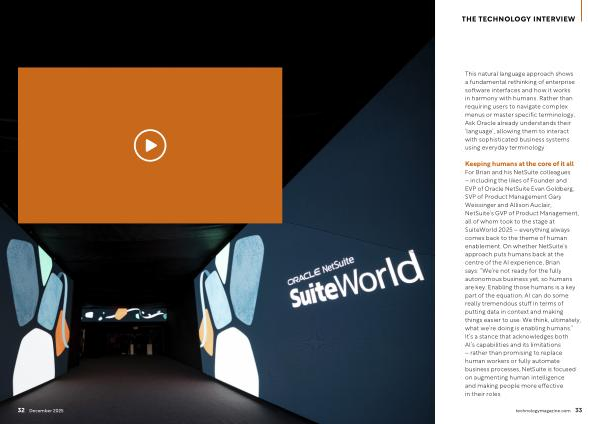 Keeping humans at the core of it all For Brian and his NetSuite colleagues – including the likes of Founder and EVP of Oracle NetSuite Evan Goldberg, SVP of Product Management Gary Weissinger and Allison Auclair, NetSuite’ s GVP of Product Management, all of whom took to the stage at SuiteWorld 2025 – everything always comes back to the theme of human enablement. On whether NetSuite’ s approach puts humans back at the centre of the AI experience, Brian says:“ We’ re not ready for the fully autonomous business yet, so humans are key. Enabling those humans is a key part of the equation. AI can do some really tremendous stuff in terms of putting data in context and making things easier to use. We think, ultimately, what we’ re doing is enabling humans.” It’ s a stance that acknowledges both AI’ s capabilities and its limitations – rather than promising to replace human workers or fully automate business processes, NetSuite is focused on augmenting human intelligence and making people more effective in their roles. technologymagazine. com 33