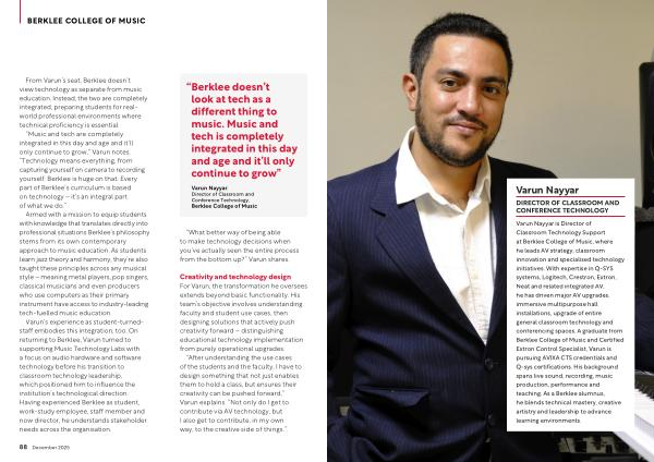 Varun Nayyar is Director of Classroom Technology Support at Berklee College of Music, where he leads AV strategy, classroom innovation and specialised technology initiatives. With expertise in Q-SYS systems, Logitech, Crestron, Extron, Neat and related integrated AV, he has driven major AV upgrades, immersive multipurpose hall installations, upgrade of entire general classroom technology and conferencing spaces. A graduate from Berklee College of Music and Certified Extron Control Specialist, Varun is pursuing AVIXA CTS credentials and Q-sys certifications. His background spans live sound, recording, music production, performance and teaching. As a Berklee alumnus, he blends technical mastery, creative artistry and leadership to advance learning environments.