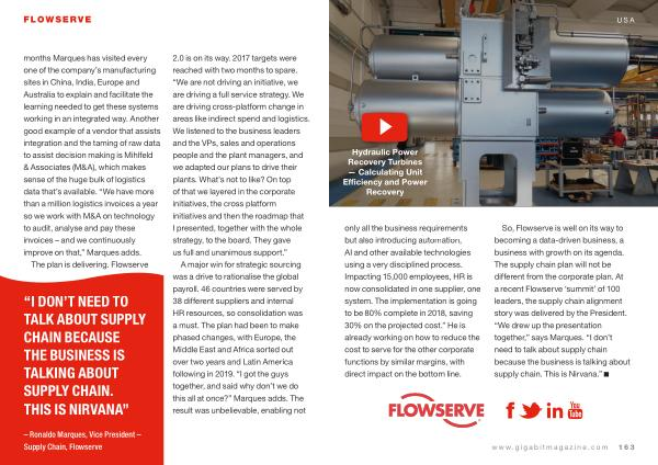 So , Flowserve is well on its way to becoming a data-driven business , a business with growth on its agenda . The supply chain plan will not be different from the corporate plan . At a recent Flowserve ‘ summit ’ of 100 leaders , the supply chain alignment story was delivered by the President . “ We drew up the presentation together ,” says Marques . “ I don ’ t need to talk about supply chain because the business is talking about supply chain . This is Nirvana .” www . gigabitmagazine . com 163