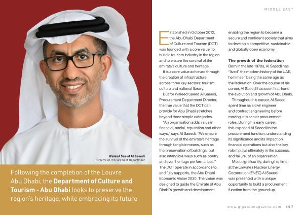 “ An organisation adds value in financial , social , reputation and other ways ,” says Al Saeedi . “ We ensure the survival of the emirate ’ s heritage through tangible means , such as the preservation of buildings , but also intangible ways such as poetry and even heritage performances .” The DCT operate in accordance to , and fully supports , the Abu Dhabi Economic Vision 2030 . The vision was designed to guide the Emirate of Abu Dhabi ’ s growth and development , enabling the region to become a secure and confident society that aims to develop a competitive , sustainable and globally open economy .