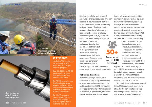 AFRICA it is also beneficial for the use of renewable energy resources . This can be seen in countries such as Chile in South America , which rely heavily on hydropower . “ During drought season , when there ’ s less water , less power becomes available ,” explains Bryant . “ So , by using our conductor , even though they ’ re not necessarily reducing emissions directly , they are able to get more out of the generation and that means that they can conserve their water resources .” Because most fossil fired generation also converts heat to steam to spin turbines , additional clean water is also saved , worldwide .