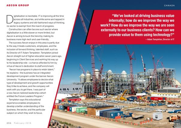 The success Aecon enjoys in this area is partly due to the way it treats customers , employees , and the inclusion of forward thinking , talented staff , such as its Director of IT Adam Templeton . Templeton joined Aecon straight out of higher education seven years ago , beginning in Client Services and working his way up to his leadership role – a chance afforded to him by virtue of Aecon ’ s dedication to staff enrichment .