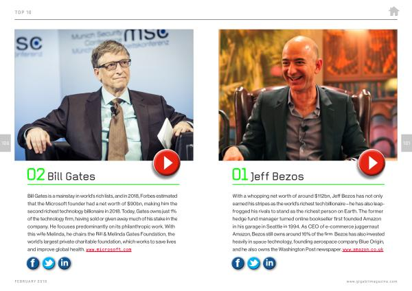 01 Jeff Bezos With a whopping net worth of around $ 112bn , Jeff Bezos has not only earned his stripes as the world ’ s richest tech billionaire – he has also leapfrogged his rivals to stand as the richest person on Earth . The former hedge fund manager turned online bookseller first founded Amazon in his garage in Seattle in 1994 . As CEO of e-commerce juggernaut Amazon , Bezos still owns around 16 % of the firm . Bezos has also invested heavily in space technology , founding aerospace company Blue Origin , and he also owns the Washington Post newspaper . www . amazon . co . uk