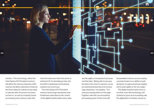 122 solution . This technology , called the ‘ Intel Optane DC Persistent memory ’ will define the memory hierarchy within a server and allow customers to improve the time it takes for a device to be ready to operate after the power has been turned on , as well as enabling faster processing and a memory type that holds the data even when the server is switched off . As Aertebjerg notes , the benefits to databases and business analytics are enormous .