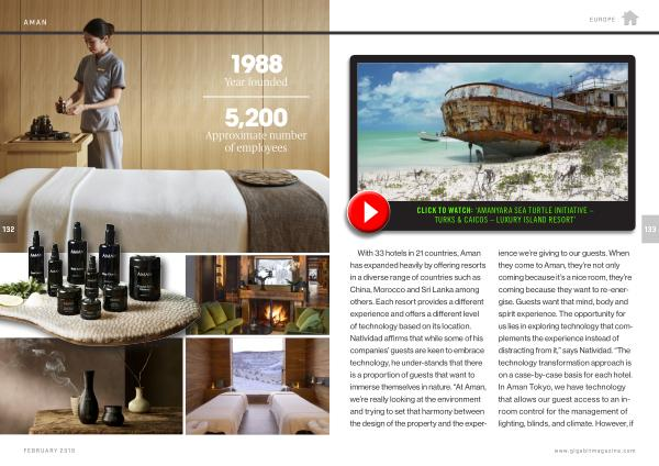 With 33 hotels in 21 countries , Aman has expanded heavily by offering resorts in a diverse range of countries such as China , Morocco and Sri Lanka among others . Each resort provides a different experience and offers a different level of technology based on its location . Natividad affirms that while some of his companies ’ guests are keen to embrace technology , he under-stands that there is a proportion of guests that want to immerse themselves in nature . “ At Aman , we ’ re really looking at the environment and trying to set that harmony between the design of the property and the exper- ience we ’ re giving to our guests . When they come to Aman , they ’ re not only coming because it ’ s a nice room , they ’ re coming because they want to re-energise . Guests want that mind , body and spirit experience . The opportunity for us lies in exploring technology that complements the experience instead of distracting from it ,” says Natividad . “ The technology transformation approach is on a case-by-case basis for each hotel . In Aman Tokyo , we have technology that allows our guest access to an inroom control for the management of lighting , blinds , and climate . However , if