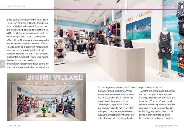 172 cloud-based technology in the near future . The current strategy will lay the foundation for an entirely cloud-based infrastructure , and while Champagne admits that there is a little trepidation in placing all major systems within a single cloud solution , he is proud of how diligent the company has been in the way it is approaching this transition . La Vie en Rose has worked closely with Amazon and Microsoft and is investing in this cloud journey incrementally , rather than isolating money into a full project . This he feels makes it easier for the company from a financial perspective but it also opens the door to the innovative technologies that are