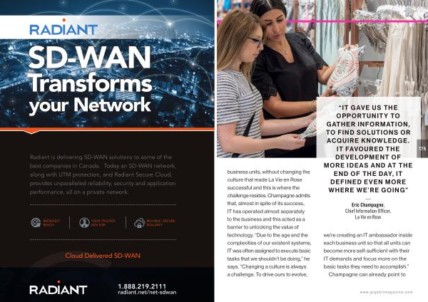 Radiant is delivering SD-WAN solutions to some of the best companies in Canada . Today an SD-WAN network , along with UTM protection , and Radiant Secure Cloud , provides unparalleled reliability , security and application performance , all on a private network .