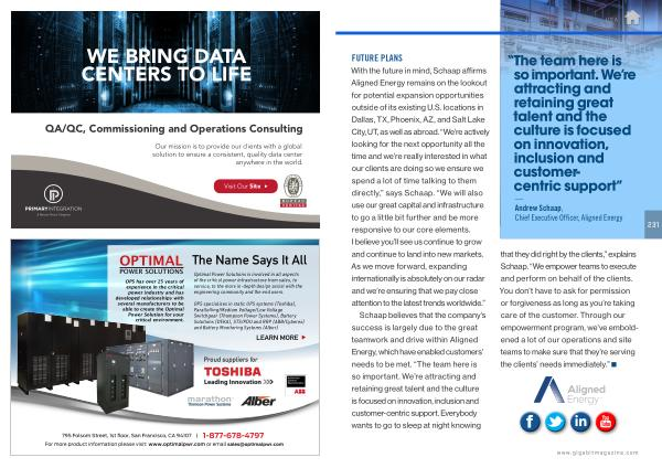 With the future in mind , Schaap affirms Aligned Energy remains on the lookout for potential expansion opportunities outside of its existing U . S . locations in Dallas , TX , Phoenix , AZ , and Salt Lake City , UT , as well as abroad . “ We ’ re actively looking for the next opportunity all the time and we ’ re really interested in what our clients are doing so we ensure we spend a lot of time talking to them directly ,” says Schaap . “ We will also use our great capital and infrastructure to go a little bit further and be more responsive to our core elements . I believe you ’ ll see us continue to grow and continue to land into new markets . As we move forward , expanding internationally is absolutely on our radar and we ’ re ensuring that we pay close attention to the latest trends worldwide .”