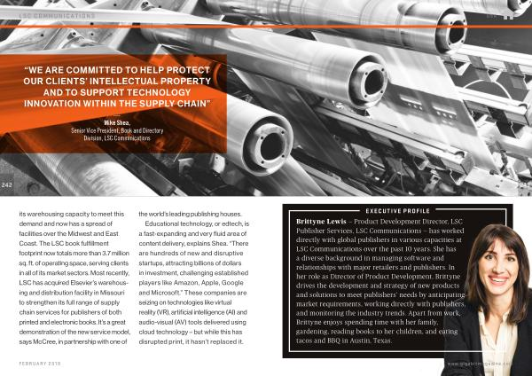 EXECUTIVE PROFILE Brittyne Lewis — Product Development Director , LSC Publisher Services , LSC Communications — has worked directly with global publishers in various capacities at LSC Communications over the past 10 years . She has a diverse background in managing software and relationships with major retailers and publishers . In her role as Director of Product Development , Brittyne drives the development and strategy of new products and solutions to meet publishers ’ needs by anticipating market requirements , working directly with publishers , and monitoring the industry trends . Apart from work , Brittyne enjoys spending time with her family , gardening , reading books to her children , and eating tacos and BBQ in Austin , Texas .
