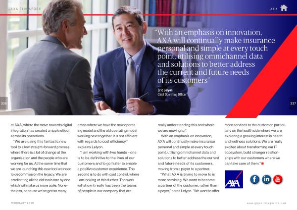“ What AXA is trying to move to is more servicing . We want to become a partner of the customer , rather than a payer ,” notes Lelyon . “ We want to offer more services to the customer , particularly on the health side where we are exploring a growing interest in health and wellness solutions . We are really excited about transforming our IT ecosystem , build stronger relationships with our customers where we can take care of them .”