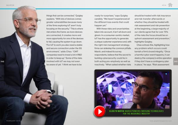 With these risks and uncertainties taken into account , it isn ’ t all doom and gloom . In a consumer-centric market , IoT has the opportunity to generate a unique customer experience and , with the right risk management strategy , firms can sidestep the common pitfalls . Marsh , and indeed its survey respondents , believe that the secret to tackling cybersecurity could lie in both acting pre-emptively as well as reactively . “ When asked whether risks should be treated with risk insurance and risk transfer afterwards or whether they should be treated with risk assessment and risk prevention at the beginning , a large majority of our clients agree that for over 75 % of the risks the focus should be on upfront assessment and prevention ,” highlights Quigley .