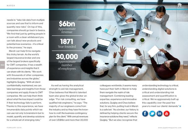 355 colleagues worldwide , it seems many have put their faith in Marsh to help them navigate the realm of risk management . Combining leading expertise , experience and innovative solutions , Quigley and Chao believe that , for any firm , putting trust in Marsh is a safe bet . “ As a broker , our history is defined by helping clients secure the insurance solutions they need ,” reflects Quigley . “ But we also recognise that understanding technology is critical , understanding digital solutions is critical and understanding risk assessment and quantification is critical . We ’ ve aggressively built up this capability over the past few years to meet our clients ’ demands .”