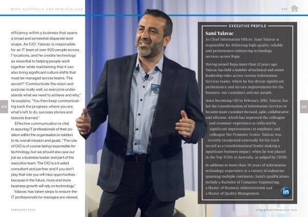 414 efficiency within a business that spans a broad and somewhat disparate landscape . As CIO , Yalavac is responsible for an IT team of over 600 people across 7 locations , and he credits technology as essential to helping people work together while maintaining that it can also bring significant culture shifts that must be managed across teams . The secret ? “ Communicate the vision and purpose really well , so everyone understands what we need to achieve and why ,” he explains . “ You then keep communicating back the progress : where you are , what ’ s left to do , success stories and lessons learned .”