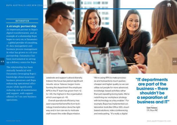 The relationship has been mutually beneficial with Datamatics leveraging Bupa ’ s knowledge about insurance business processes and Bupa enhancing operational effici – encies while significantly reducing cost of maintenance and support , with support offered 24 / 7 on core business operations . celebrate and support cultural diversity . Indeed , this focus has yielded significant results : since Yalavac began transforming the department the employee NPS in the IT team has grown from + 2 to + 48 , the highest in the organisation which averages at + 16 .
