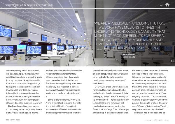 442 vations made by 19th Century whalers as an example . “ In the past , they would just keep logs to show the ship ’ s journey ,” he says . “ Now , it is possible to use 19th century whaling ship logs to map the recession of the Ice Shelf in Antarctica over time . So , you get information from one particular discipline , and then later if you maintain it well , you can use it in a completely different discipline to inform research .” The Date Arena Gale mentions is a completely immersive , three-dimensional visualisation space . Burns explains that data visualisation enables researchers to ask fundamentally different questions than they would have been able to do it in the past . “ So , the technology is really transforming the way that research is done in more ways than just making it easier to store , and perform calculations on it .”