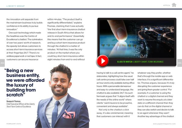 CLICK TO WATCH : LIBERTY SHORT-TERM INSURANCE 455 having to talk to a call centre agent ,” he elaborates , highlighting how the usual call centre process could take over half an hour and is only available during office hours . With a personable demeanour and easy-to-understand language , the chatbot is also available 24 / 7 . As such Vermaak argues that “ it aligns itself with the needs of the online world ” where clients “ want insurers to be proactive , convenient and always available ”.