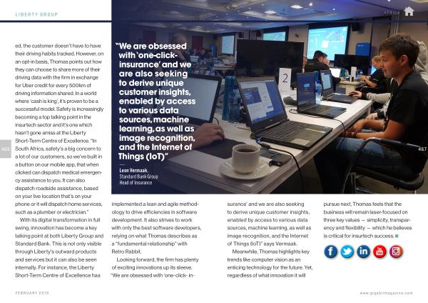 ed , the customer doesn ’ t have to have their driving habits tracked . However , on an opt-in basis , Thomas points out how they can choose to share more of their driving data with the firm in exchange for Uber credit for every 500km of driving information shared . In a world where ‘ cash is king ’, it ’ s proven to be a successful model . Safety is increasingly becoming a top talking point in the insurtech sector and it ’ s one which hasn ’ t gone amiss at the Liberty Short-Term Centre of Excellence . “ In South Africa , safety ’ s a big concern to a lot of our customers , so we ’ ve built in a button on our mobile app , that when clicked can dispatch medical emergency assistance to you . It can also dispatch roadside assistance , based on your live location that ’ s on your phone or it will dispatch home services , such as a plumber or electrician .”
