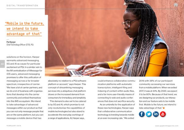 88 solutions on the horizon , Harper earmarks advanced messaging , 5G and AI as cause for particular excitement at PGi . In a similar vein to the IM centralisation of iMessage for iOS users , advanced messaging promises to offer this unification of messaging across a far broader spectrum , irrespective of carrier . “ We have a lot of carrier partners , and we do a lot of business with organisations that develop into the carrier community and embed themselves into this IMS ecosystem . We intend to take advantage of advanced messages within our product so that you can not only message people that are on the same platform , but you can message a mobile device that has absolutely no relation to a PGi software platform or account ,” says Harper . This concept of streamlining messaging services into a ubiquitous chat platform draws on the increased demand from consumers for immediacy and simplicity .
