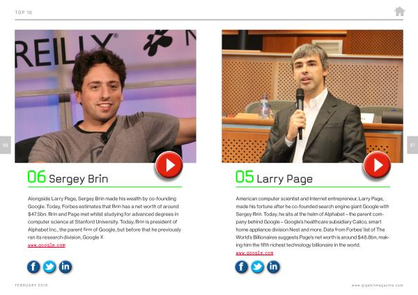 Alongside Larry Page , Sergey Brin made his wealth by co-founding Google . Today , Forbes estimates that Brin has a net worth of around $ 47.5bn . Brin and Page met whilst studying for advanced degrees in computer science at Stanford University . Today , Brin is president of Alphabet Inc ., the parent firm of Google , but before that he previously ran its research division , Google X . www . google . com FEBRUARY 2019